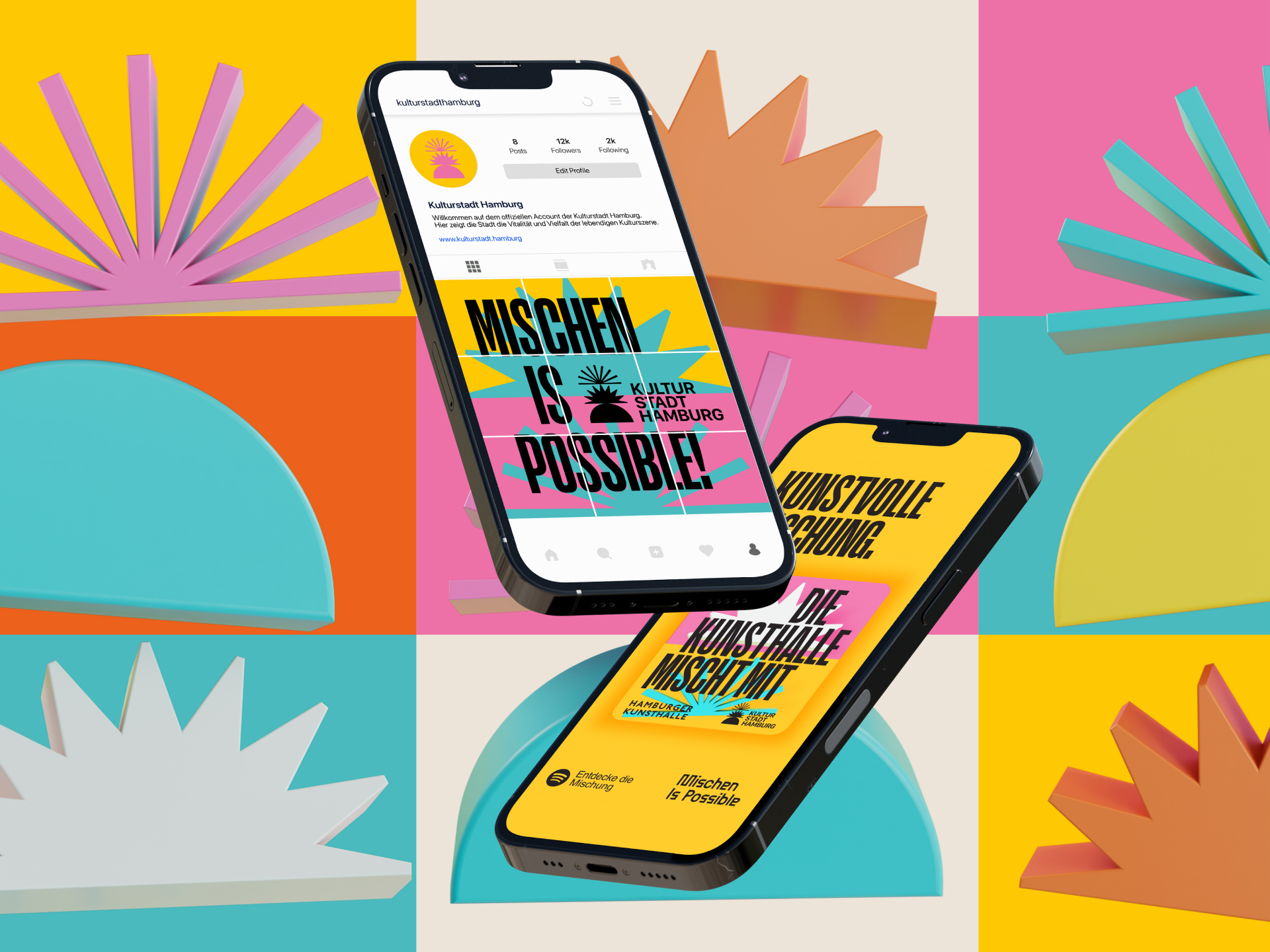 Heute Club, morgen Theater: Unter dem Kampagnendach “Mischen Is Possible” präsentieren wir die kreativsten Kulturmischungen der Stadt als Aufhänger, um neue Kulturorte und -veranstaltungen zu entdecken und mit Altbewährtem zu mischen. Der Fokus liegt neben regionaler und überregionaler Bespielung sämtlicher analoger und digitaler Touchpoints vor allem auf Social Media, wo die 360-Grad-Kampagne ihre volle virale Power entfaltet. Zu diesem Zweck haben wir der Marke Kulturstadt Hamburg ein neues digitales Zuhause in Form eines Instagram-Accounts eingerichtet, der als Hub für Ko-Kreation, Kollaboration und Campaign Messagings dient. Wir kreieren zahlreiche Möglichkeiten der Mitgestaltung, von user-generated Content für Creators bis hin zu eigens konzipierten und produzierten Contentformaten für Multiplikator*innen und Kulturpartner*innen, um unserer Kernbotschaft maximale Schubkraft und Reichweite zu verschaffen.